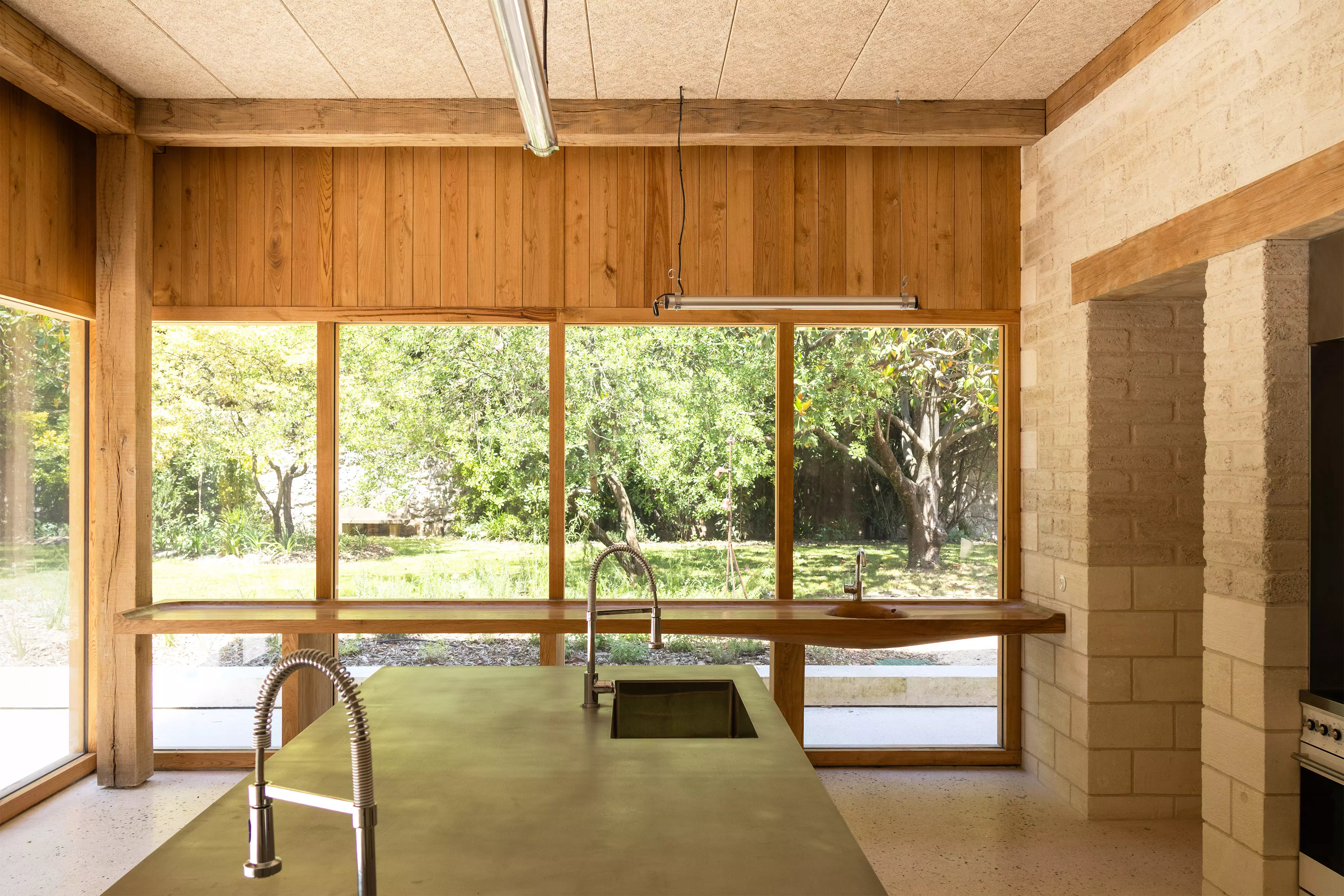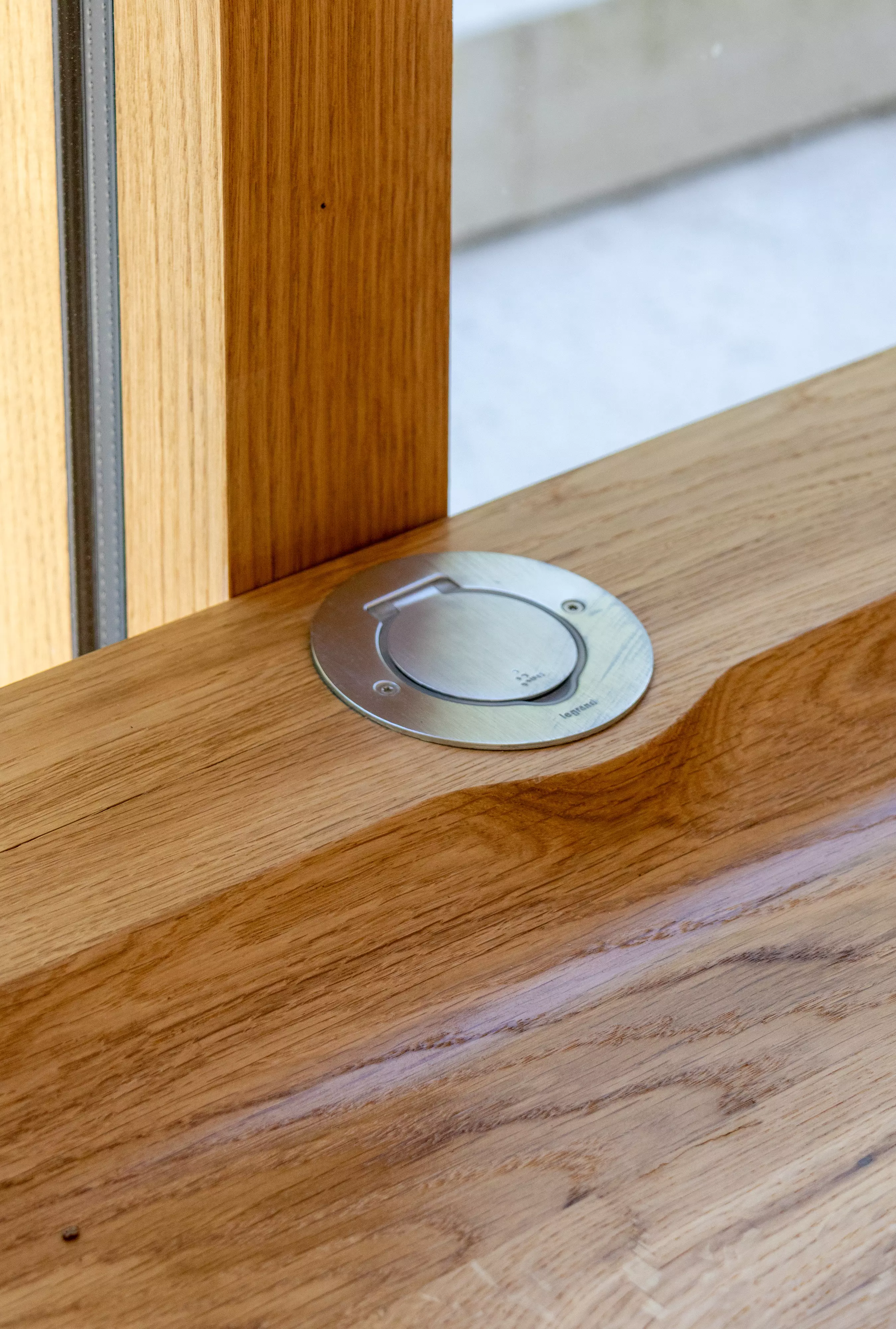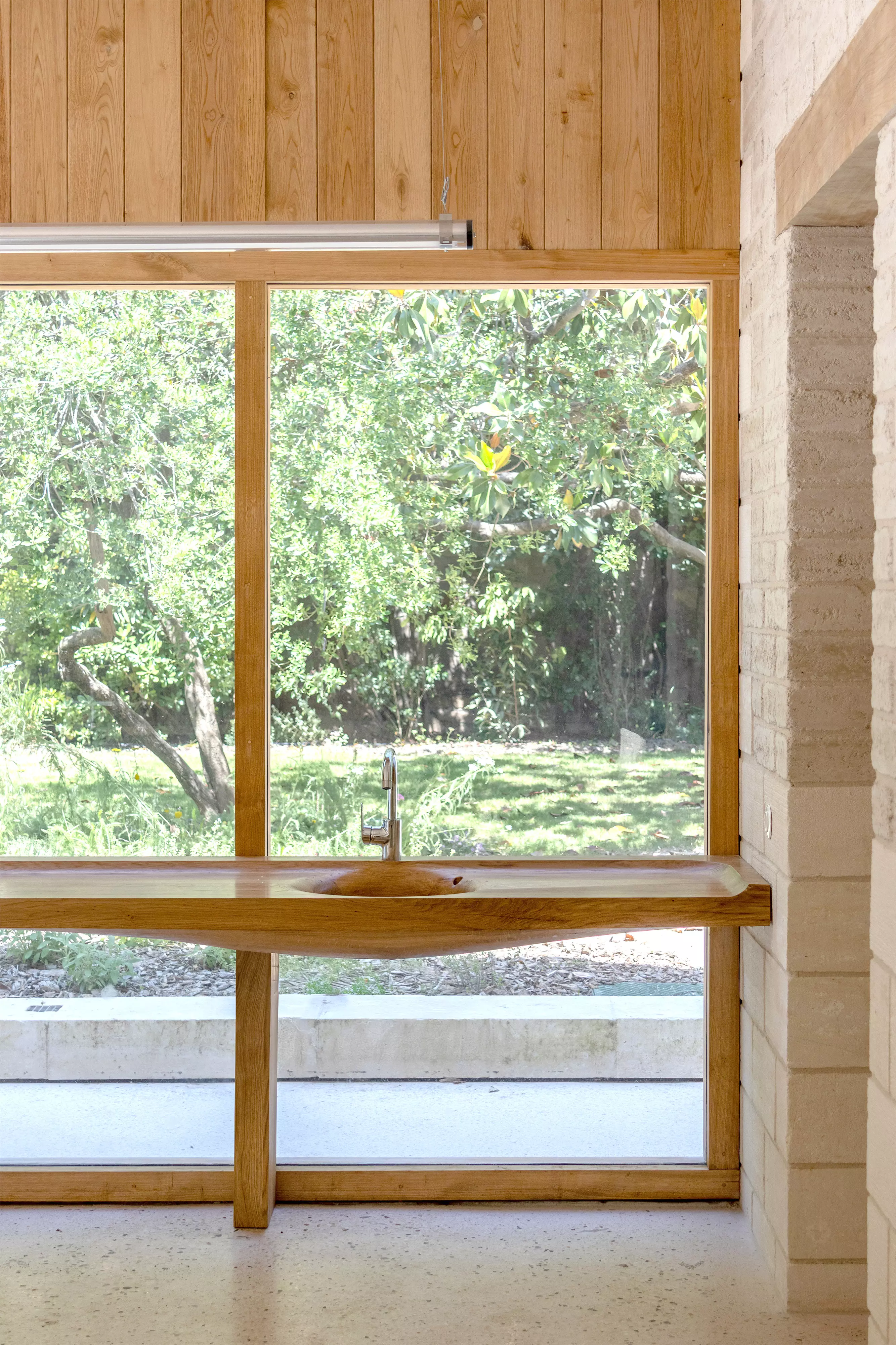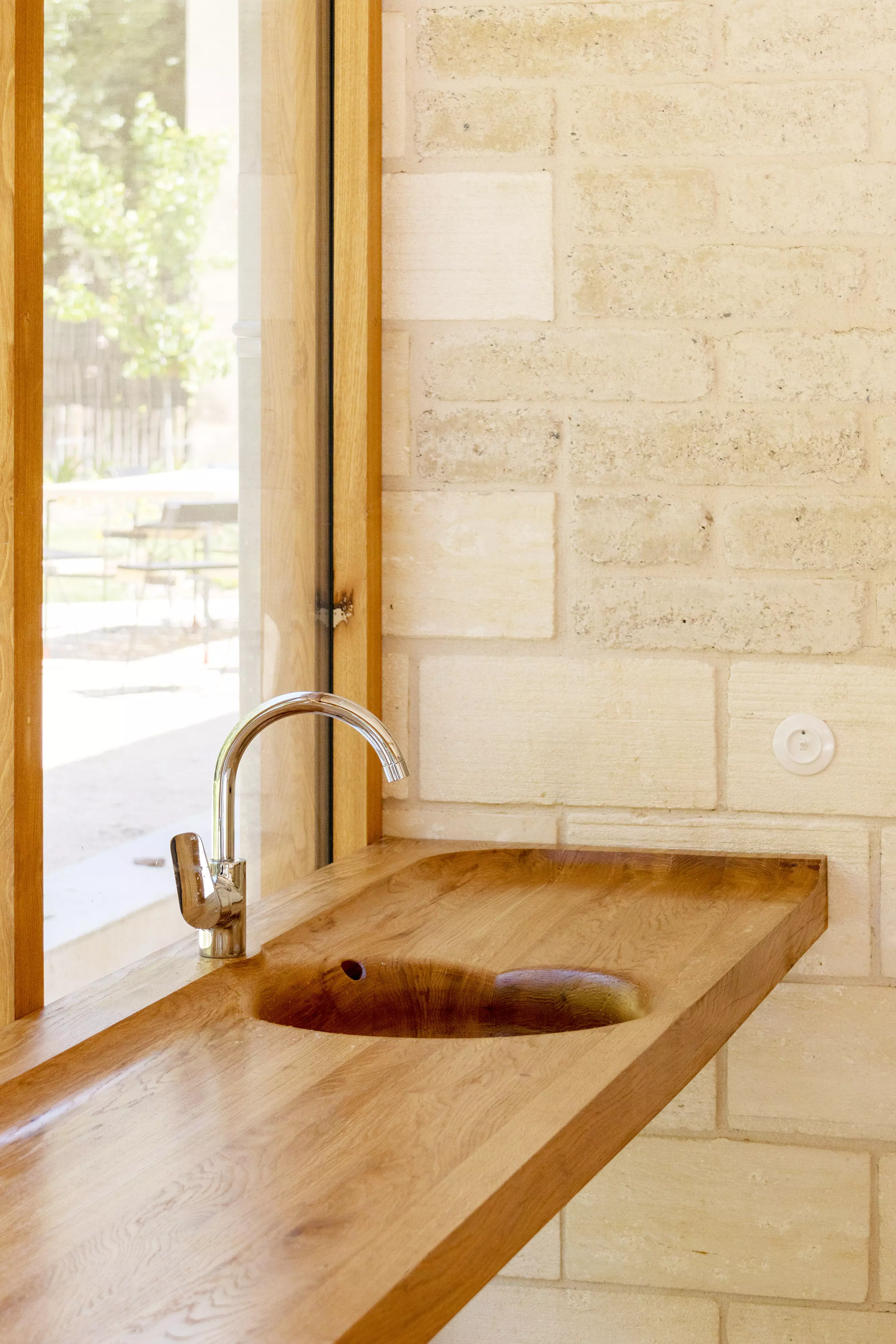 Pièce maitresse du réfectoire de la résidence Paoli à Arles. Ce plan de travail en chêne au design organique participe à la qualité relationnelle entre l’espace de la cuisine et les jardins.